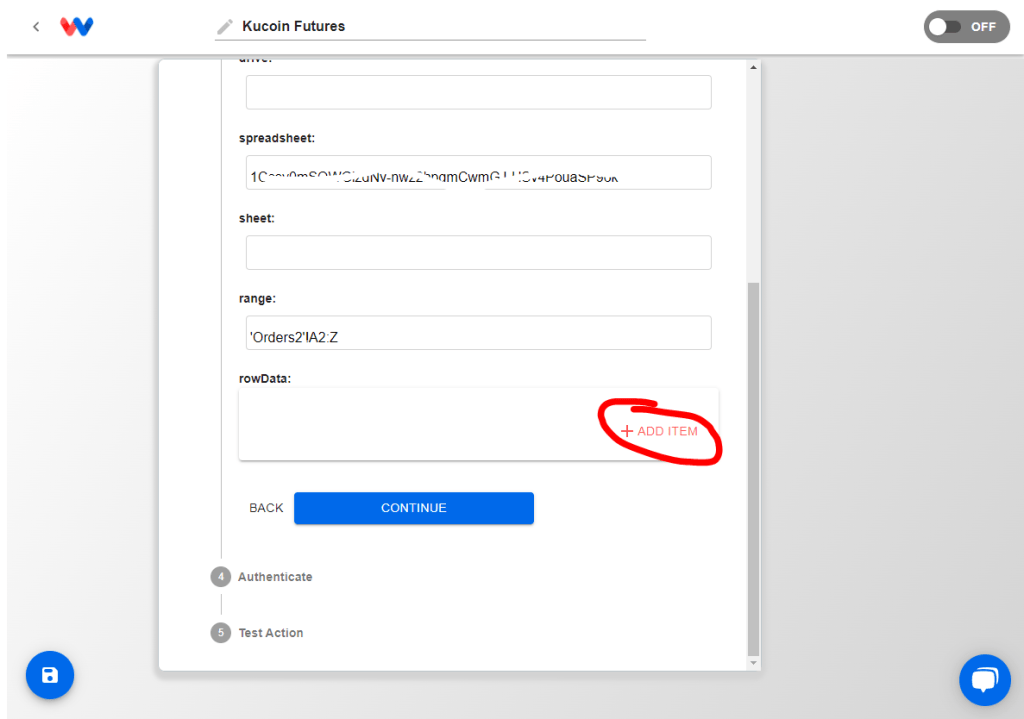 Step 6: Setup the Google Sheets append data step to paste data from the Kucoin Futures API step