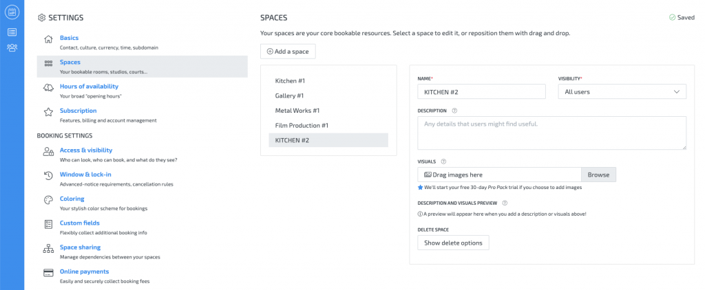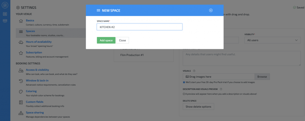 Click the “Add a space” option and fill the title of your space. In this example we’ll use “Kitchen #2”.