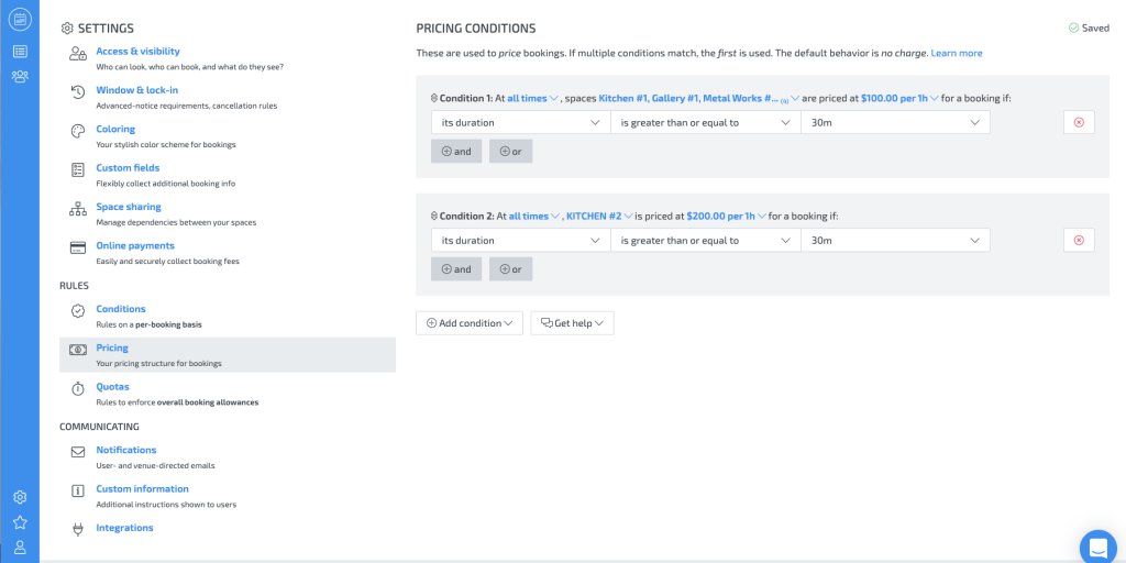 Simply change the dropdowns to reflect the rule exactly how you would want it. In this case we have one rule that says “All times and all spaces are $100/hr for a booking over 30m (our minimum window), except Kitchen #2, which is $200/hr. See the completed formula in the screenshot below.