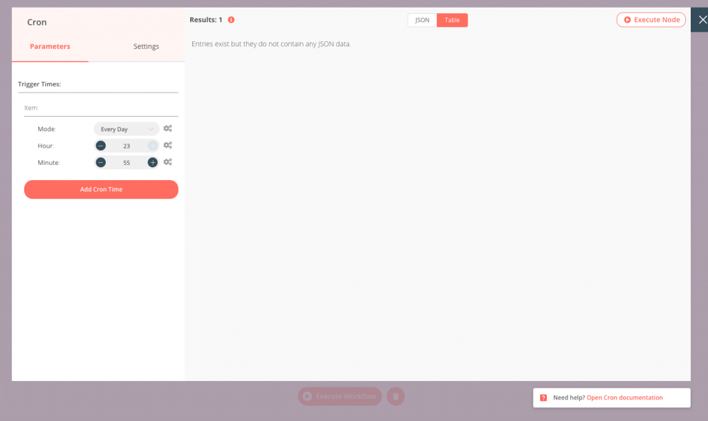Make sure you save the workflow and give it a name that’s easy to remember later. In the upper right corner of the editor UI, you should also activate your workflow. If you want to quickly test what you’ve built, just change your cron job to run within the next hour. You can also run each module independently and then see what the data looks like for the next step.